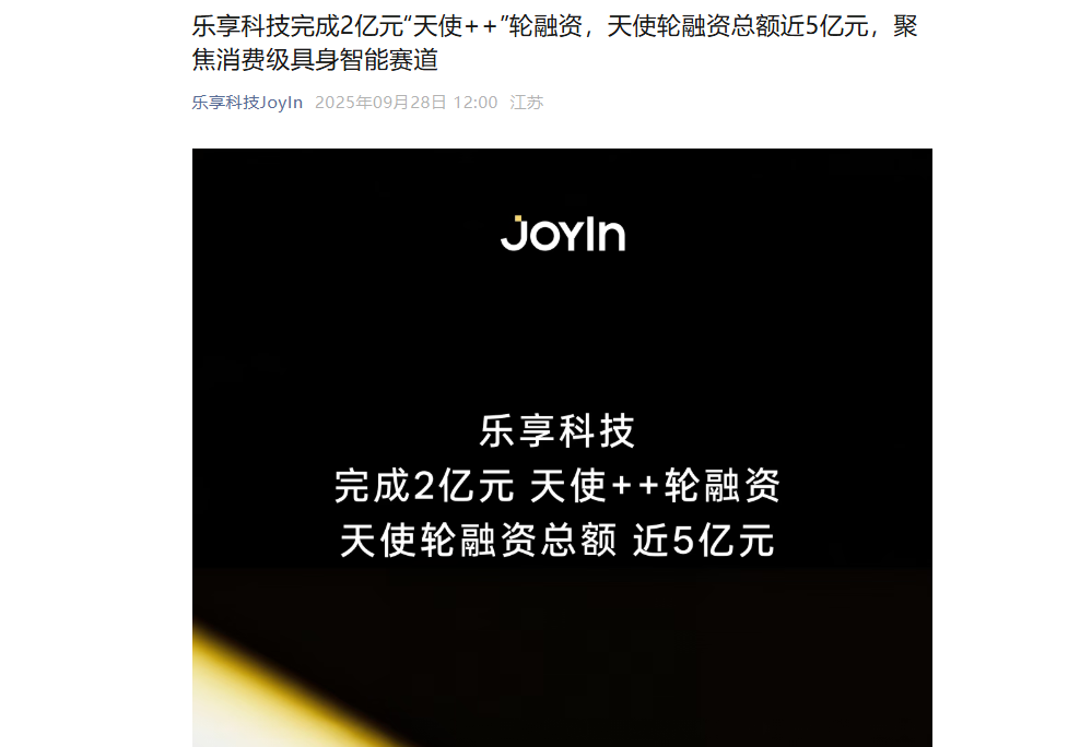 9月28日,消费级具身智能企业苏州乐享智能科技有限公司正式宣布完成2亿元“天使++”轮融资。这已是乐享科技在9个月内完成的第三轮融资,天使轮融资总金额接近5亿元。